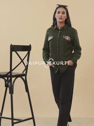 Add this cosy winter shirt and stay stylish. Made in wool fabric, this Green Embroidered Woolen Shirt has full sleeves, a front button placket, a collar and embroidered front pockets.