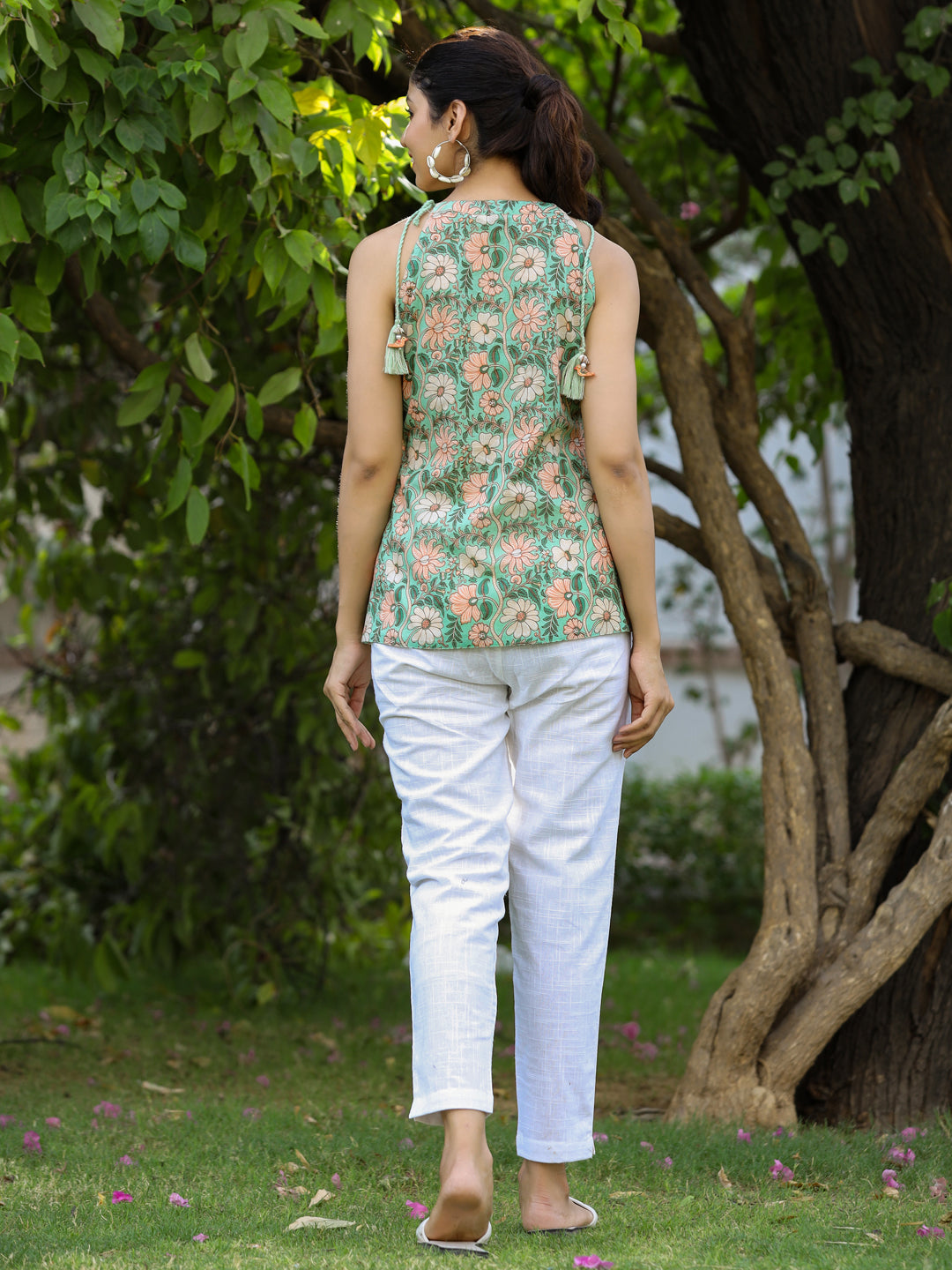 Embrace the bright sunshine in Green Ethnic Printed Cotton Tie-Up Top. The top features stunning prints with a halter neck with tie-up and tassels and a straight hemline.