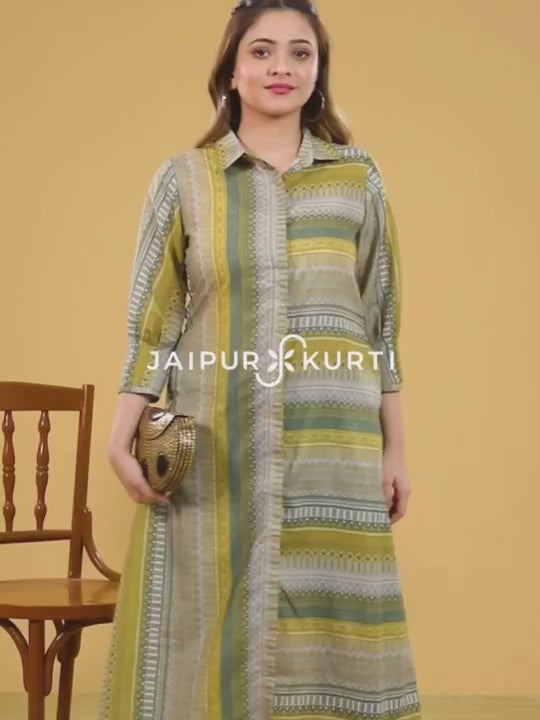 Opt for a decent look in this Green Geometric Printed A-line Kurta. Made in model muslin fabric, it has a shirt collar, three-quarter cuffed sleeves and an A-line pattern.