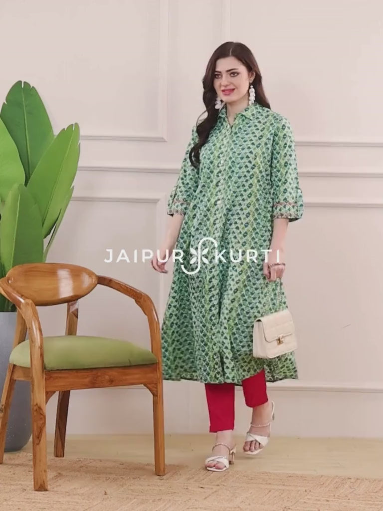 Made in soft cotton fabric, this Green Geometric Printed Princess Cut Kurta has a shirt collar and embroidered three-quarter sleeves.
