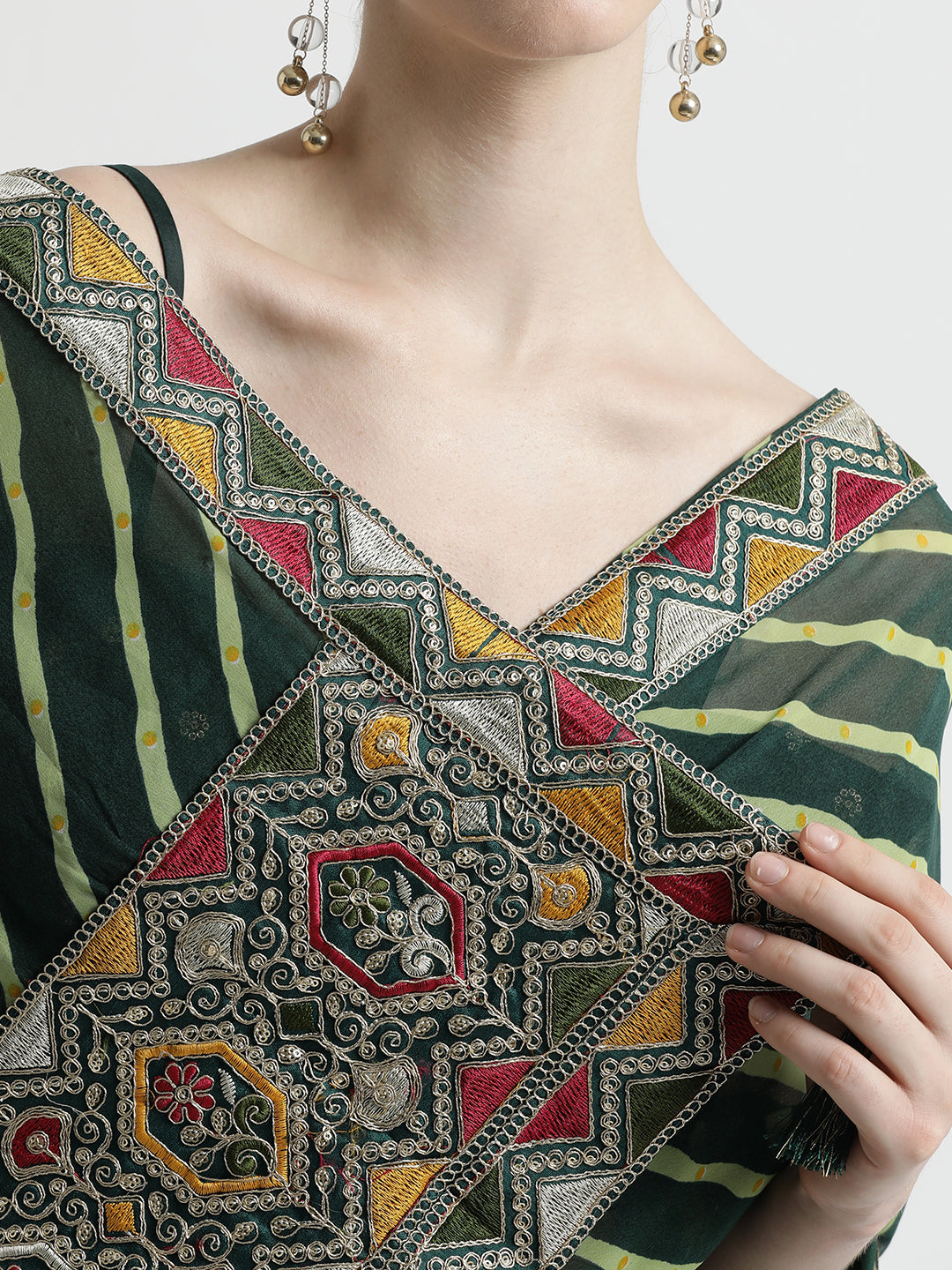Give a traditional touch to your wardrobe with this Leheriya Embroidered Pure Georgette Saree. It has embroidered lace on borders and tassels at the hems.