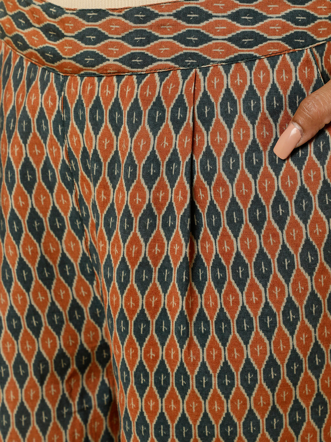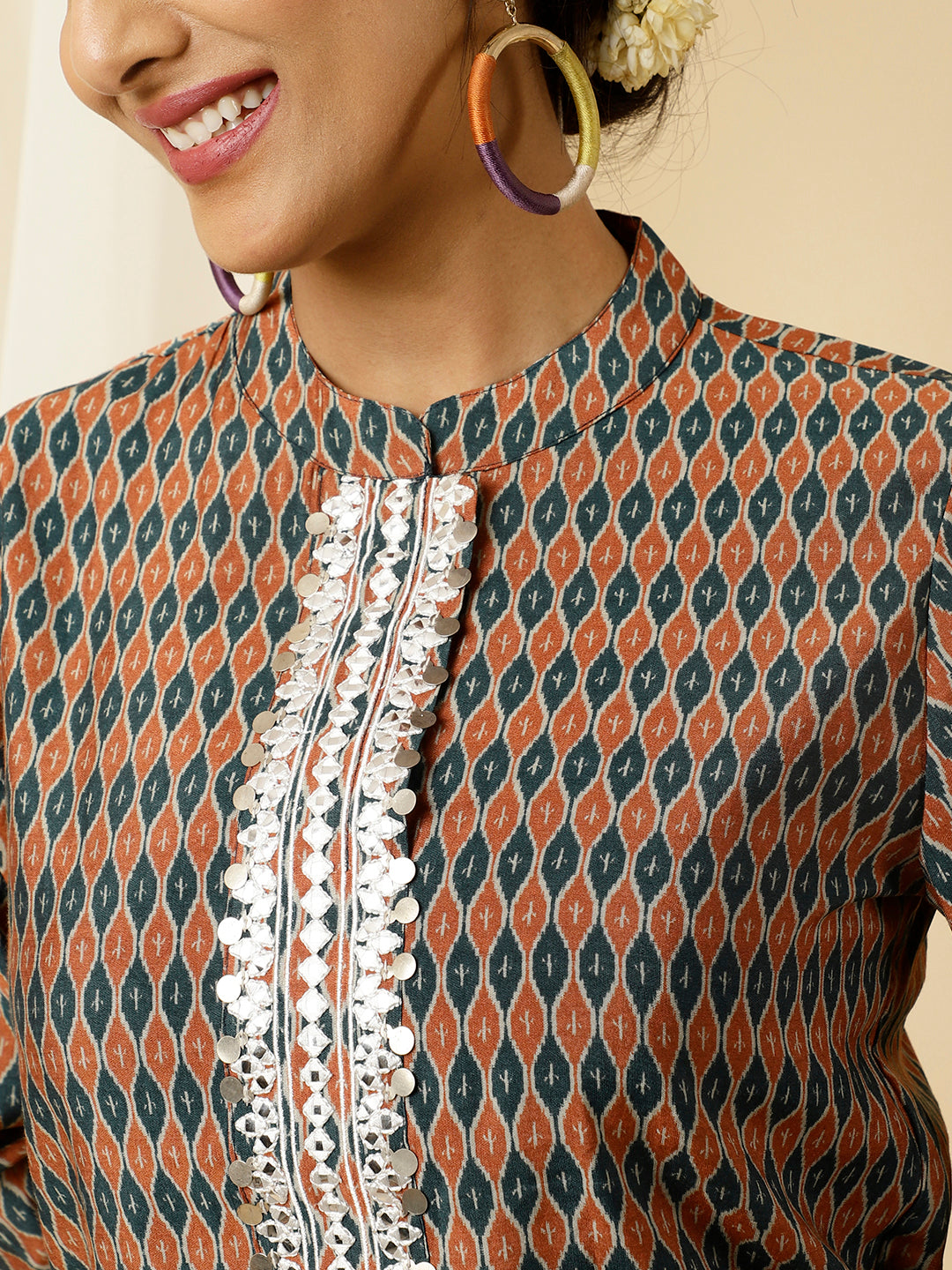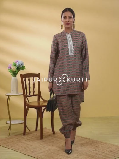 Flaunt a classy look in our beautiful Green Mirror Work Short Kurta With Pants Co-ord Set. Tailored with sartorial perfection, this set comes with an abstract printed short kurta and pants. The kurta has a mandarin collar, mirror work with white thread on the yoke, cuffed full sleeves and a high-low hem. The pants have elasticated hems which gives it a salwar look.