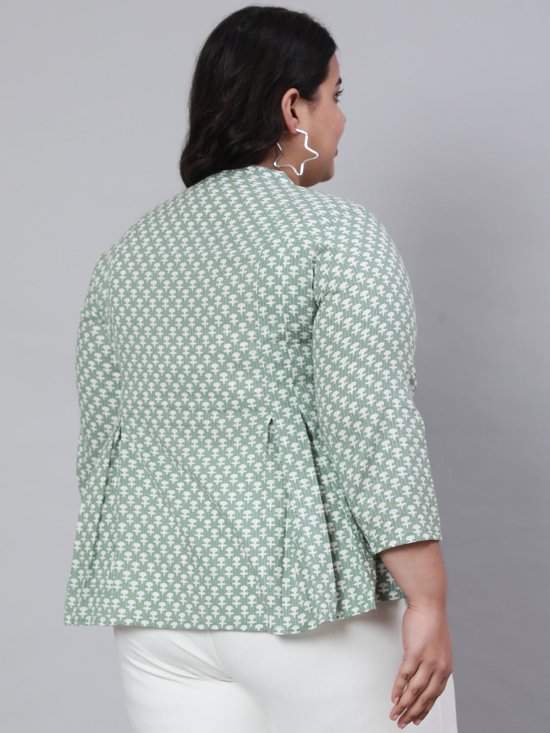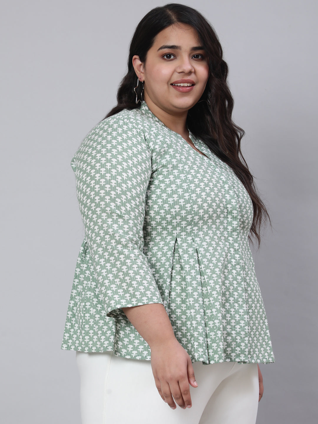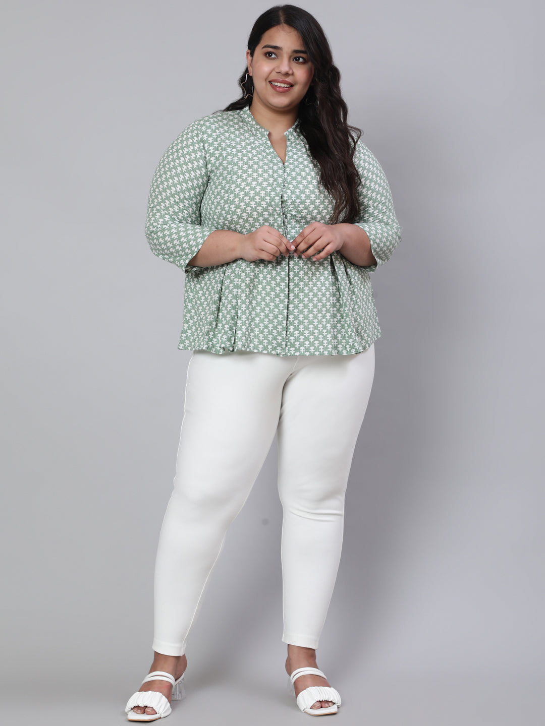 Embrace delicate prints crafted into chic silhouettes. Featuring our Green Plus Size Woven Printed Pleated Top with Mandarin collar, invisible button placket, and three-quarter sleeves.