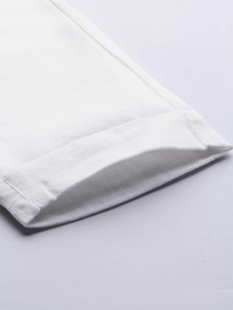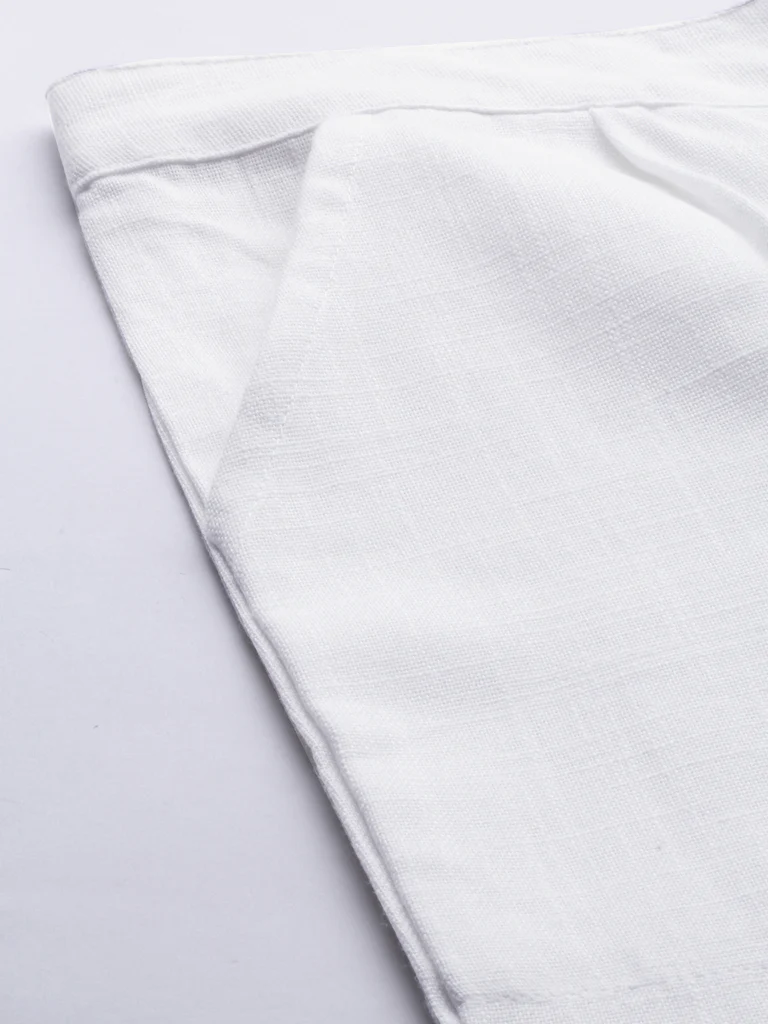 A classy office wear look which comes with comfort and style in one! The silk blend shirt looks luxurious with a front opening placket, three-quarter puffed sleeves with buttons and a curved hemline. Paired with white cotton pants which have pleat details below the waistband, both side pockets and a partially elasticated waistband.