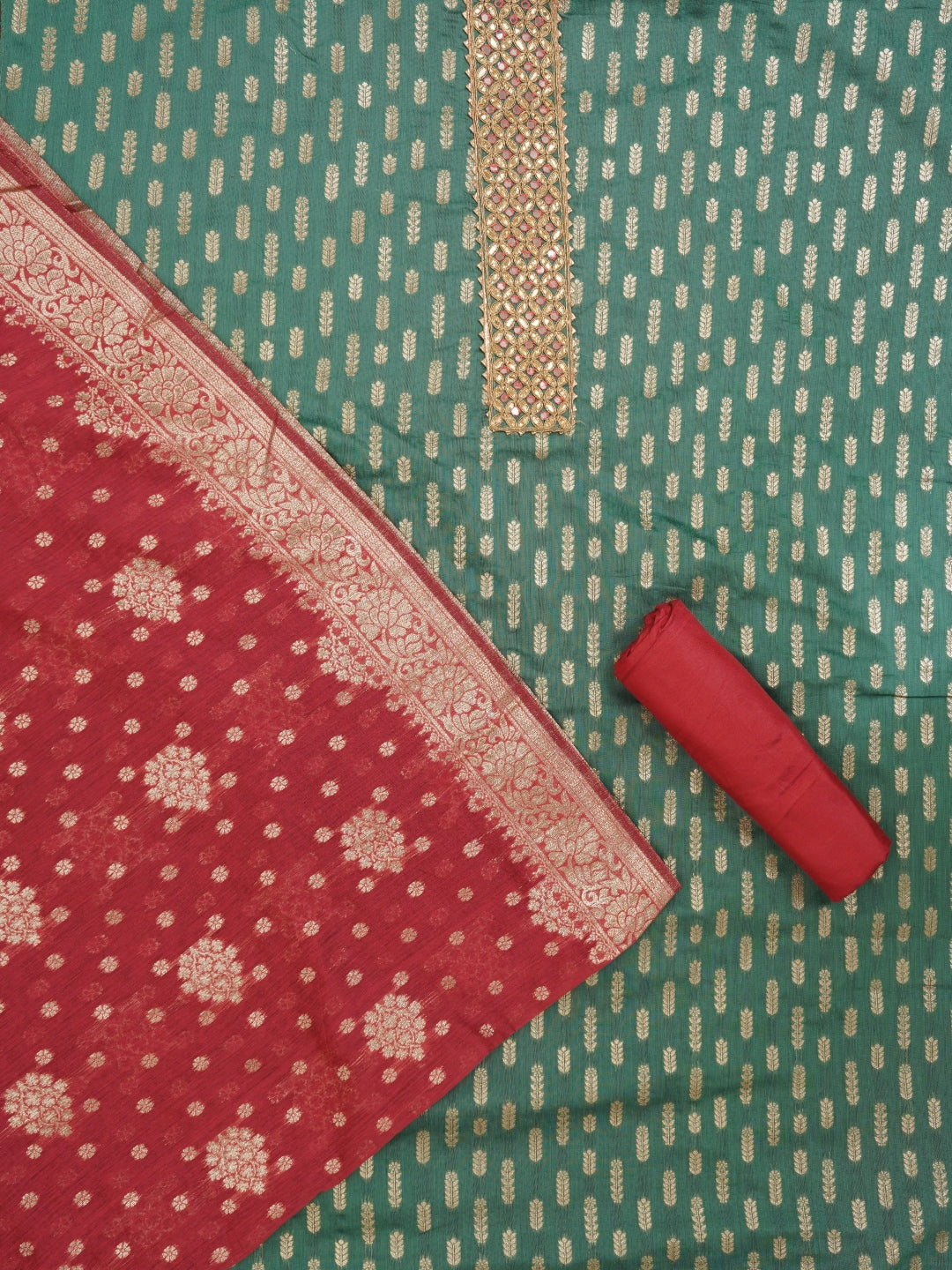 Green Unstitched Silk Blend Embellished Dress Material With Dupatta