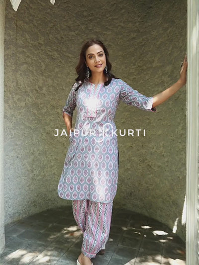 An incredible pick for your everyday ethnic wardrobe, this Grey Ethnic Motif Printed Straight Kurta With Zig-Zag Printed Afghani Salwar is crafted from a plush cotton fabric with an alluring hand-block print detailing. It features a round neck with a notch, border detailing with lace on the front placket, three-quarter asymmetrical sleeves, and a straight hemline with an attractive and comfortable Zig-zag printed Afghani Salwar