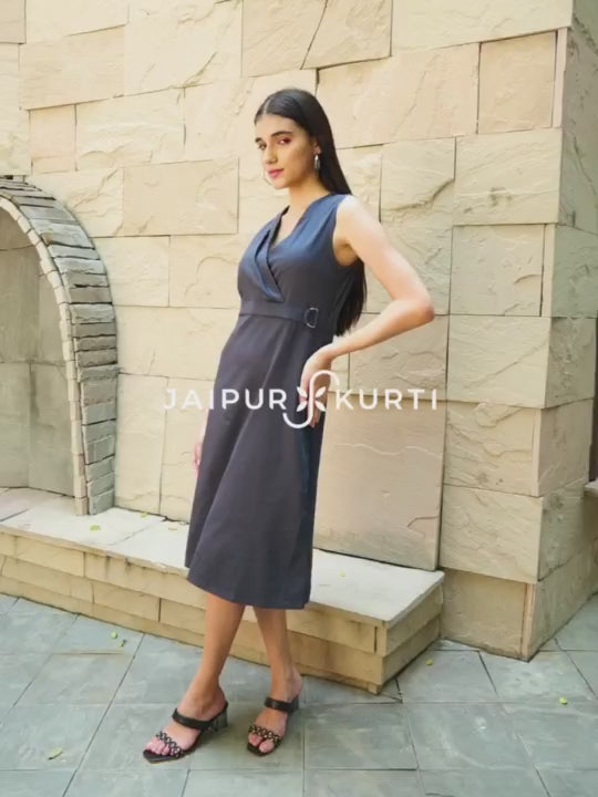 Ideal for daytime soiree, this sleeveless Grey Straight Fit Dress With Belt Detail is designed with a clean-cut silhouette from crisp cotton lycra fabric. It has an overlapping V-neckline with an illusion belt and a metal buckle for a formal chic look. Wear it with espadrilles and stud earrings for a simple yet urbane look.