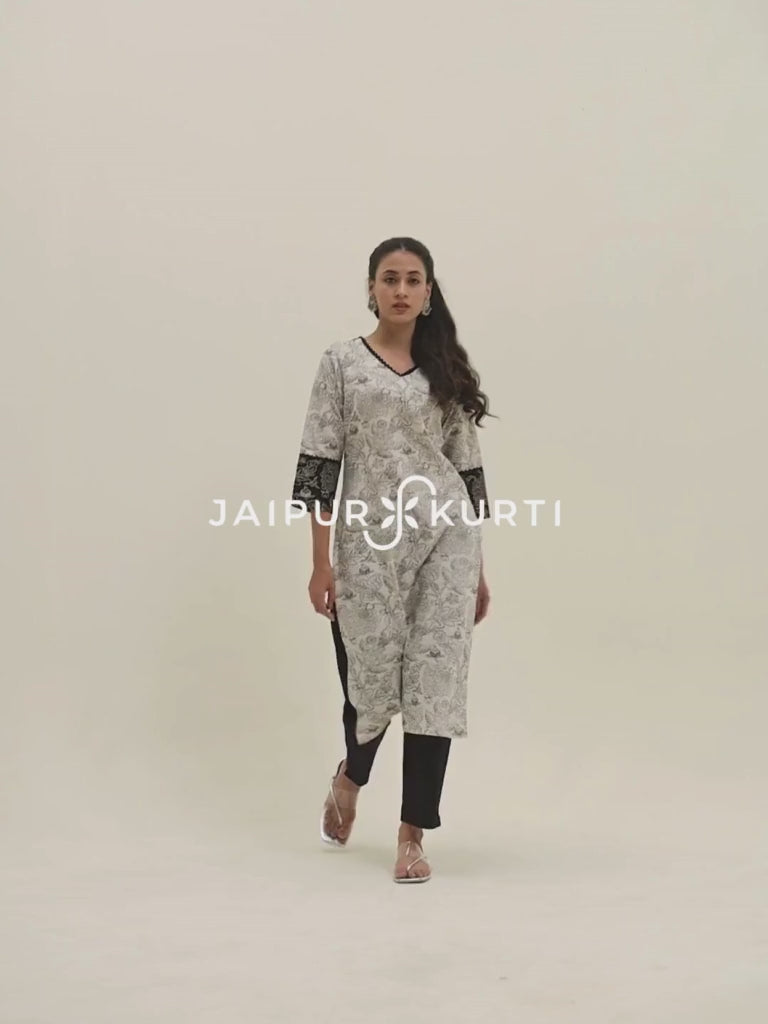 This Black Handblock Printed Kurta has a v-neckline, three-quarter sleeves, crochet lace details and threadwork. Paired with solid black pants with a partially elasticated waistband.