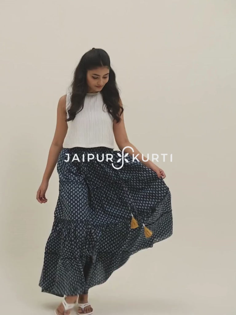 Swirl in style with this Indigo Blue Handblock Printed Cotton Skirt has a tiered pattern and with drawstrings.