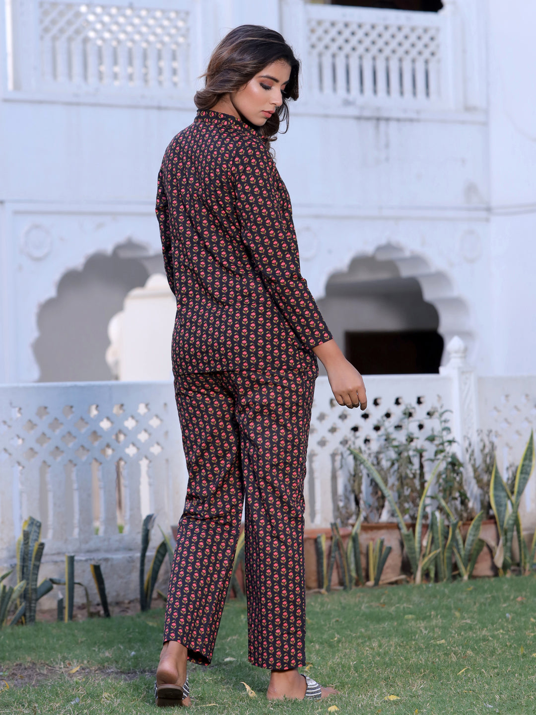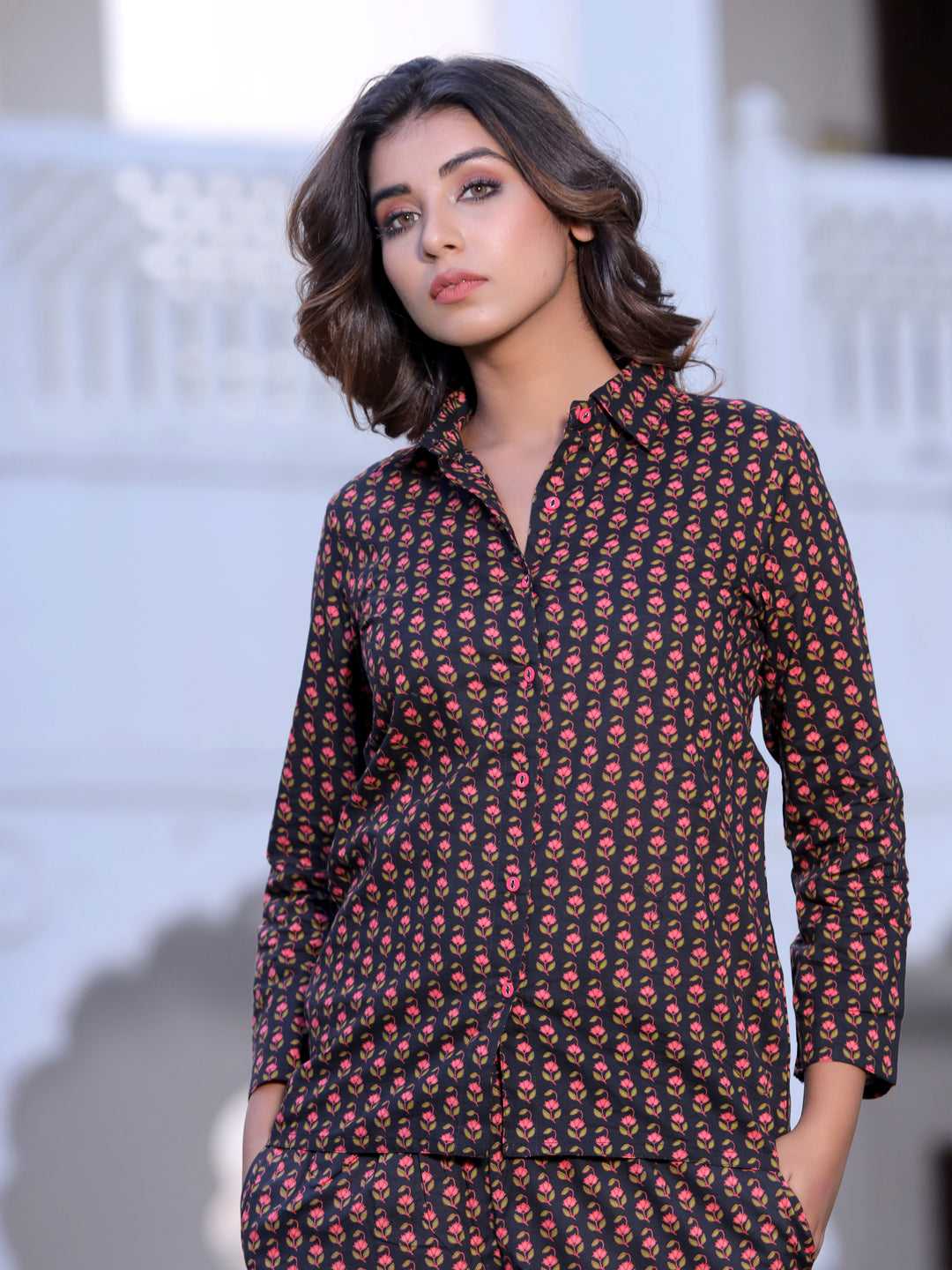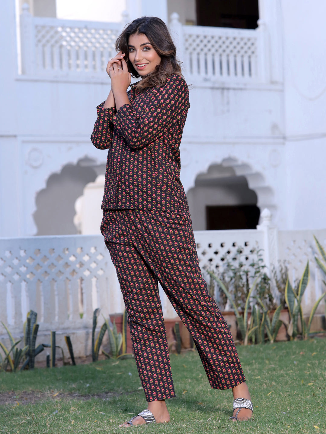Black Floral print Sleepwear Consists Of Shirt And Pyjamas Black Printed Shirt Has A Shirt Collar, Pocket, Full Sleeve, Button Closure A Pair Of Black Printed Pyjamas, Has A Inner Drawstring Closure And Full Elasticated Belt With Two Side Pockets