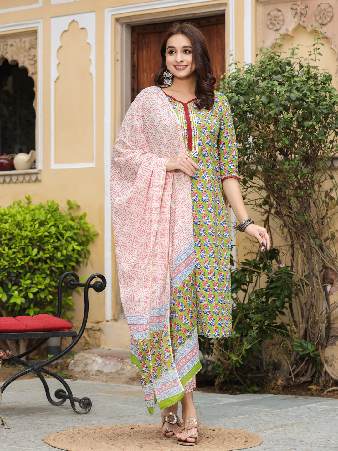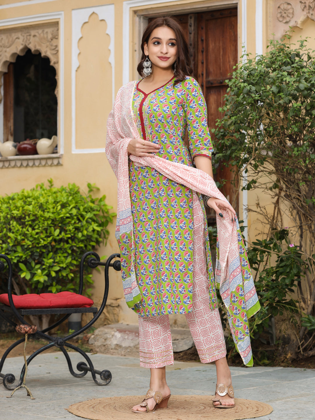 Green Printed Straight Kurta With Palazzos & Dupatta