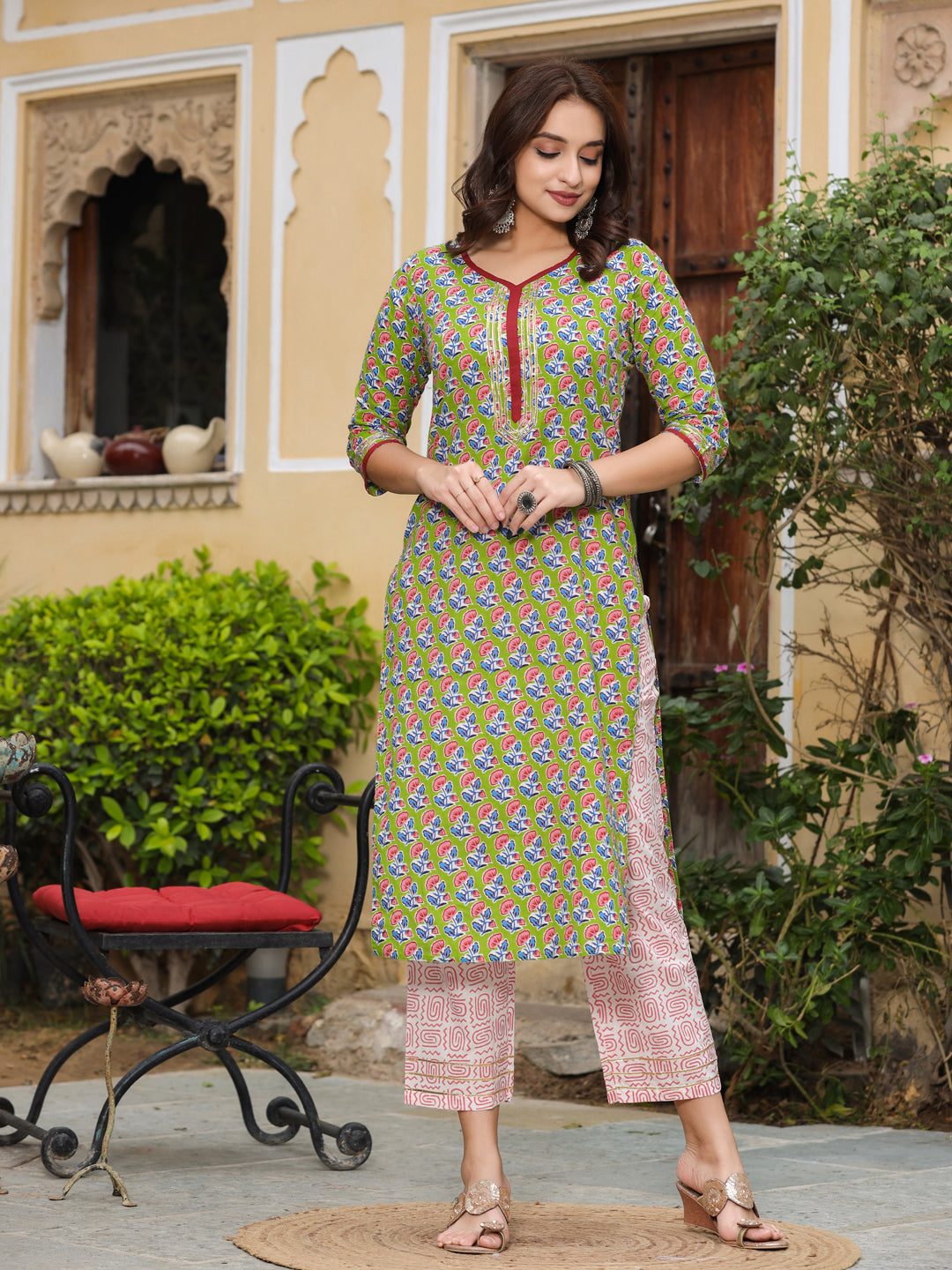 Green ethnic print straight cotton kurta has contrast and charki lace work detail on the neck and sleeves, three-quarter sleeves, side slits, and a straight hem