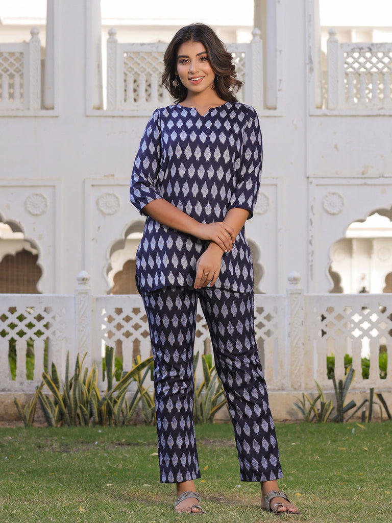 Navy Blue Ikat Print Straight Viscos Rayon Lounge Wear