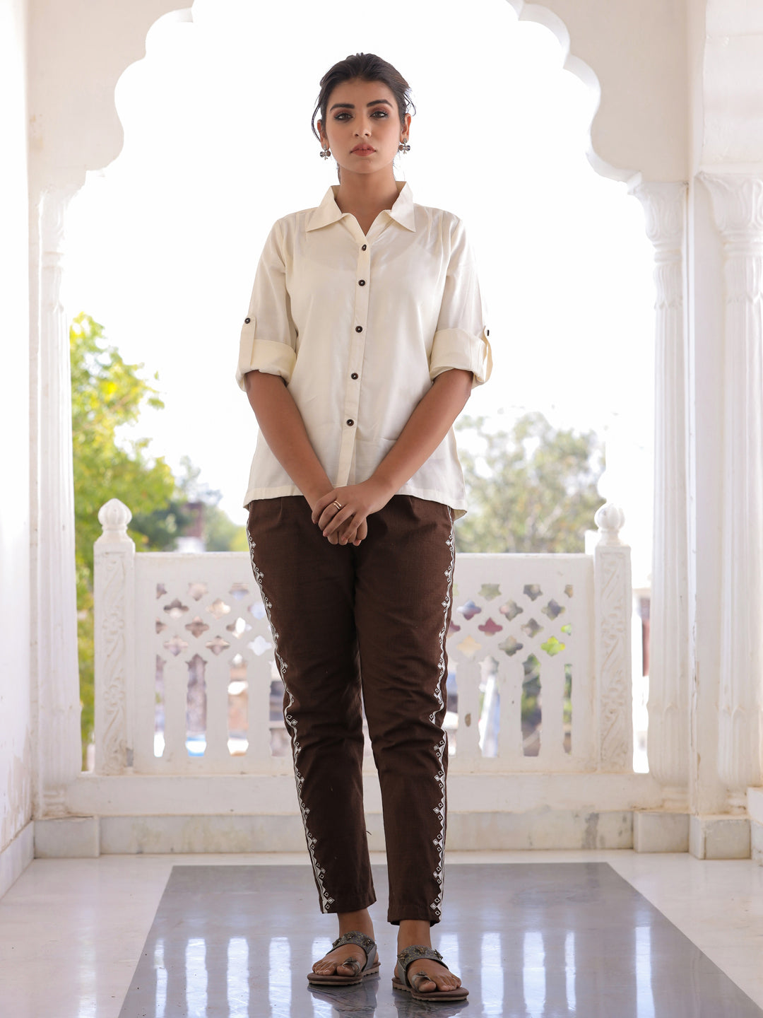 Off-White & Brown Solid Shirt With Side Printed Trousers