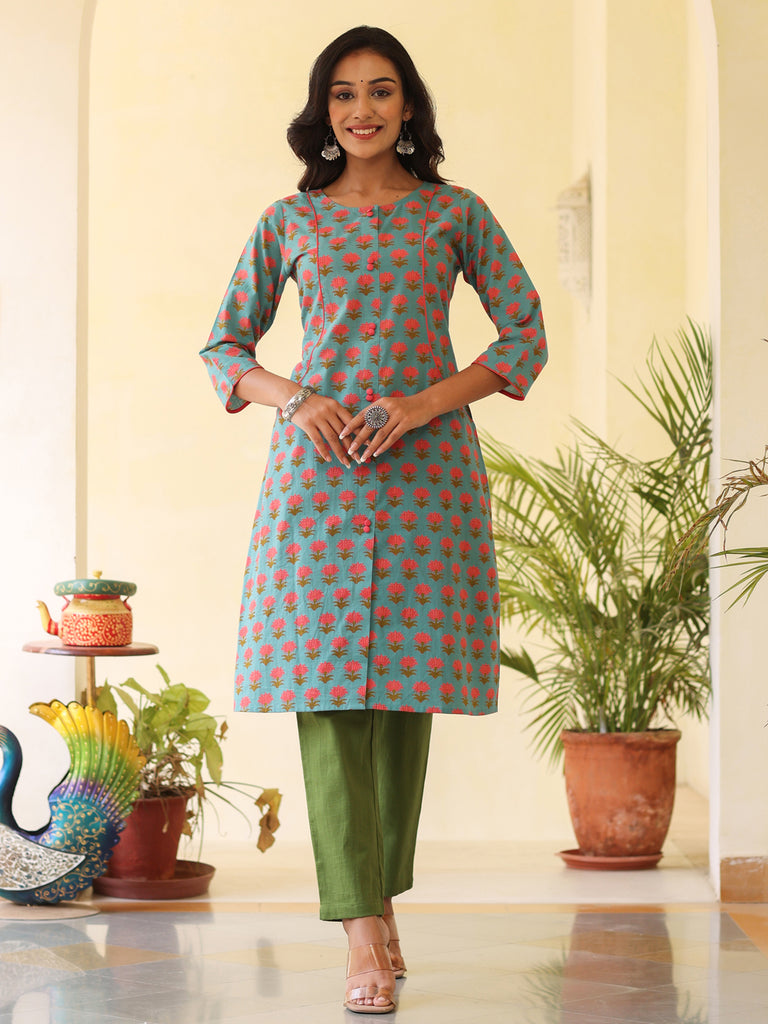 Blue Cotton Printed A Line Kurta With Front Slit And Princesses Cut Detailing With Contrast Colour Piping, Pocket In Front Both Side. 3/4 Sleeves.