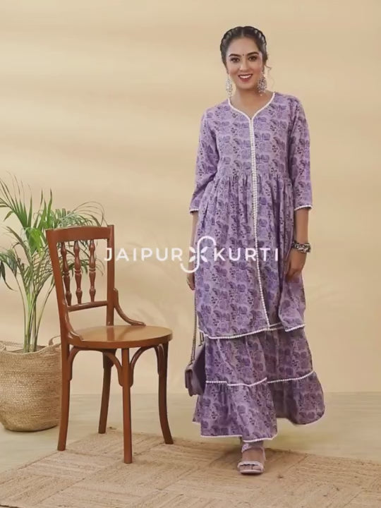 Lavender Floral Print Flared Kurta With Sharara