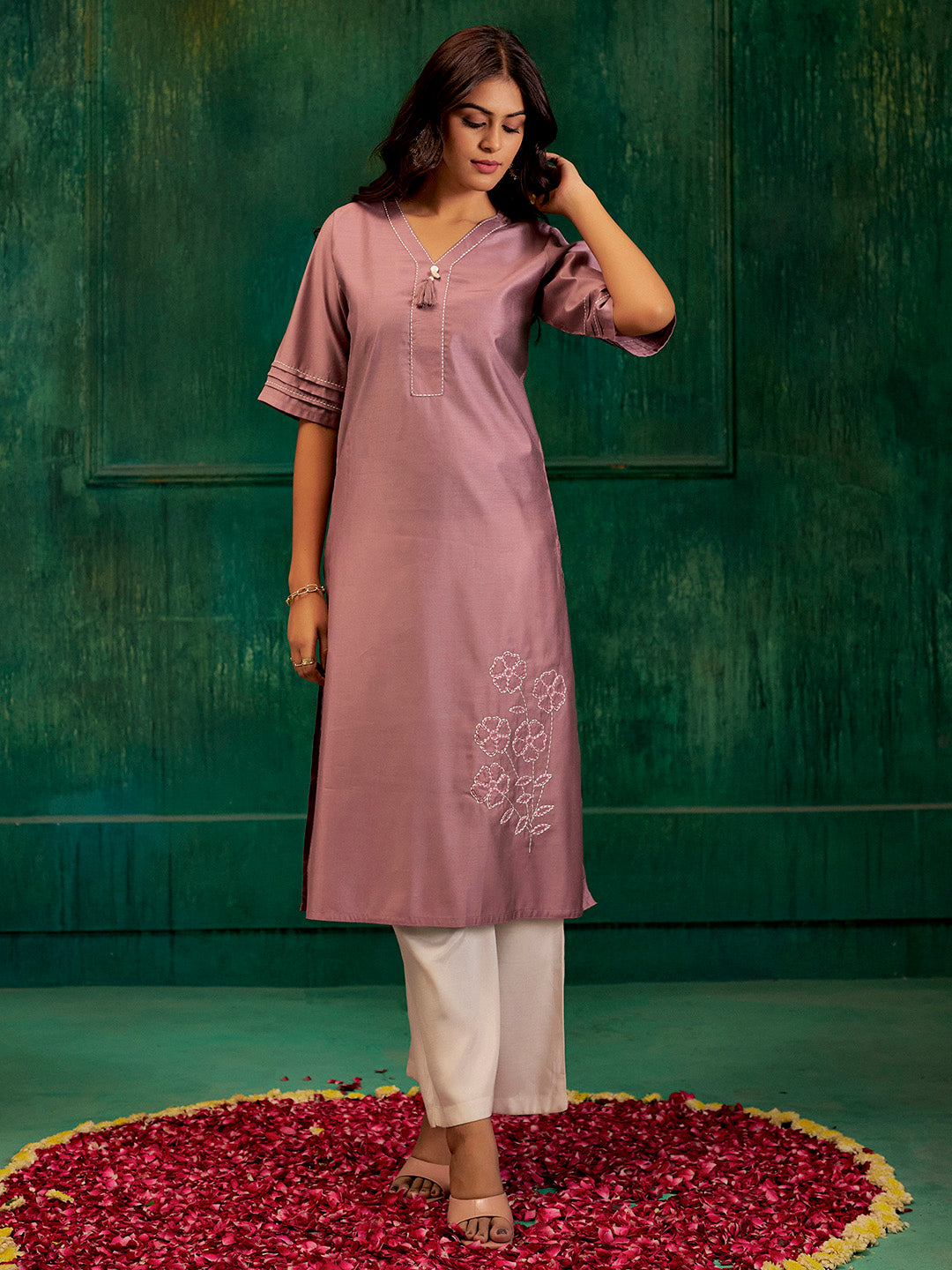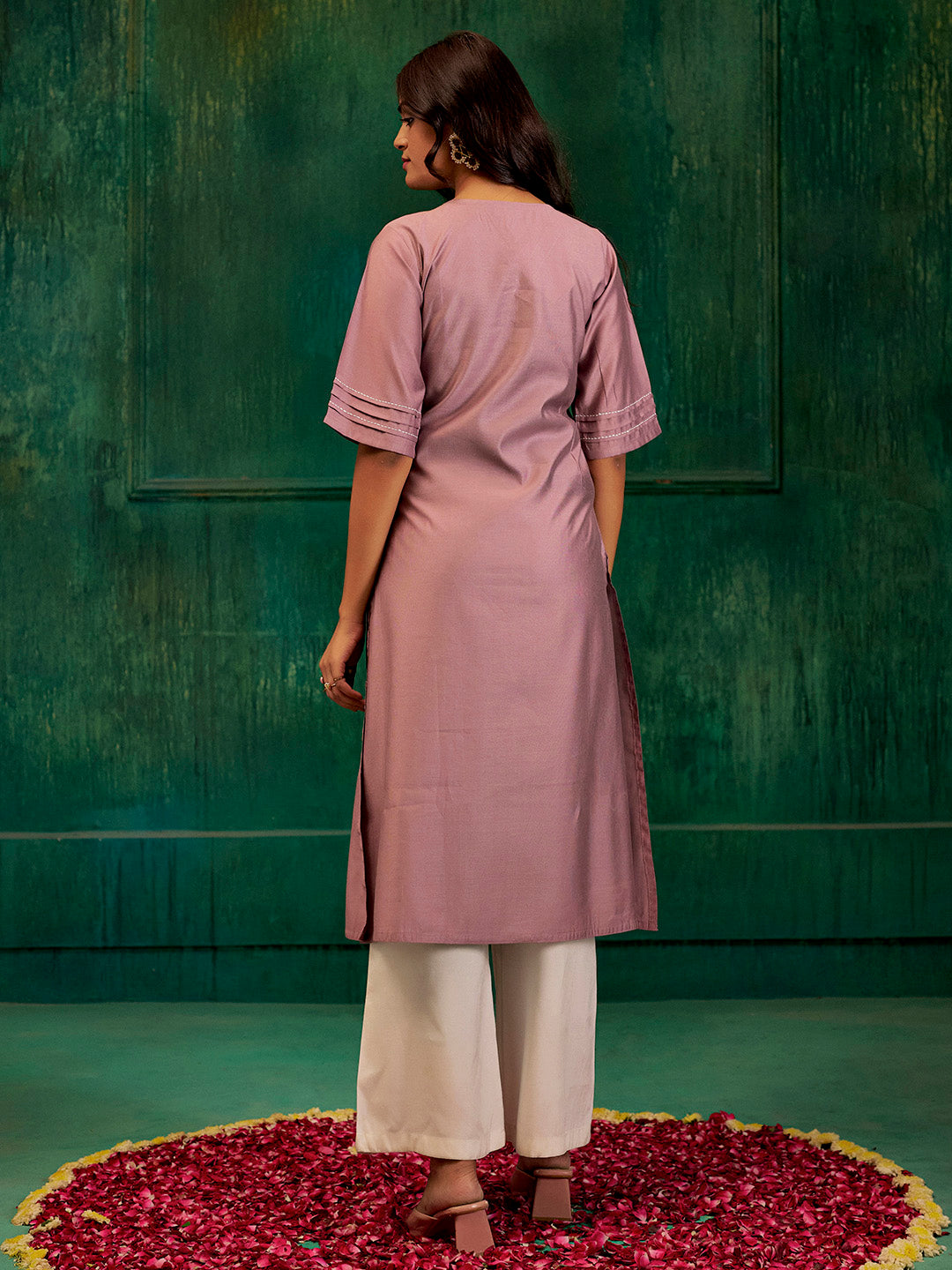 Carry a statement style in this Lavender Self Woven Embroidered Straight Kurta. It has a v-neck, pleated half sleeves and resham embroidery.