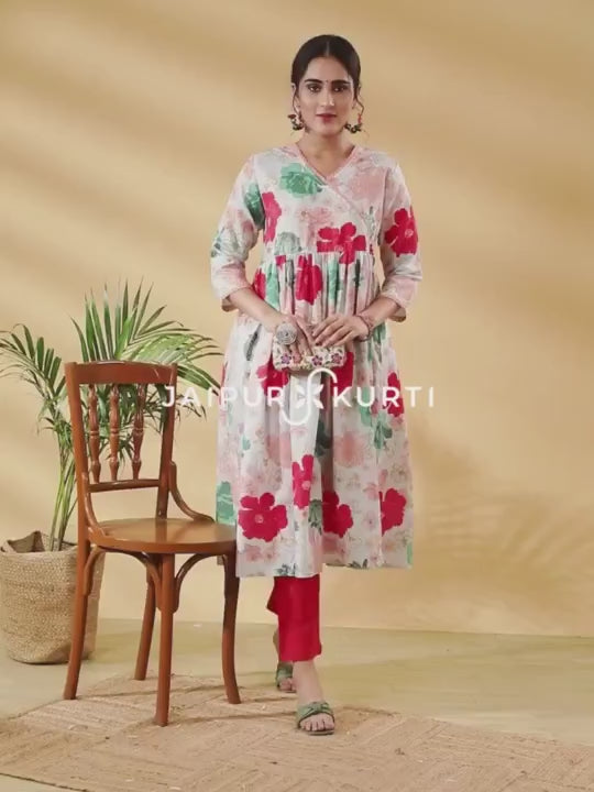 Light Blue Floral Printed Gathered Angrakha Kurta
