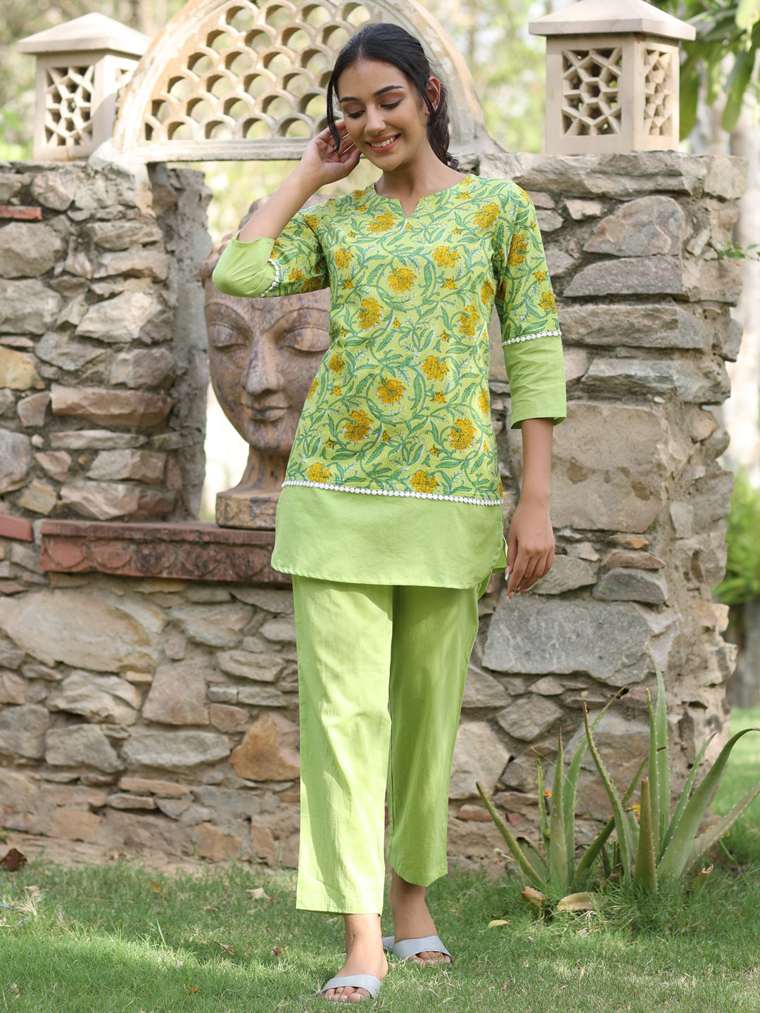 Make a statement in a Lime Green Floral Printed Cotton Top With Solid Pants Loungewear Set. Crafted from the plushest cotton cambric fabrics, this set features a top with a round neck with a notch, three-quarter sleeves with a pom-pom lace solid border, side slits, and a curved hemline. Paired with solid pants with a partially elasticated waistband and 2 side pockets.