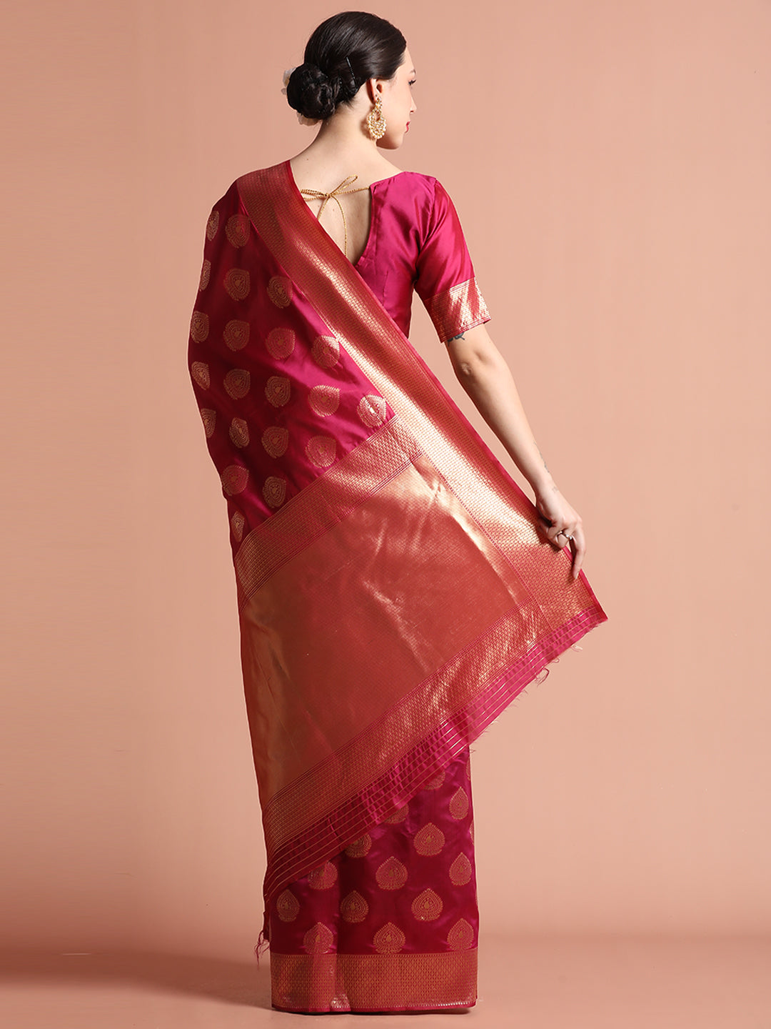 Embrace elegance in this Magenta Zari Woven Design Silk Banarasi Saree. It has zari woven design motifs all over and a beautiful border.