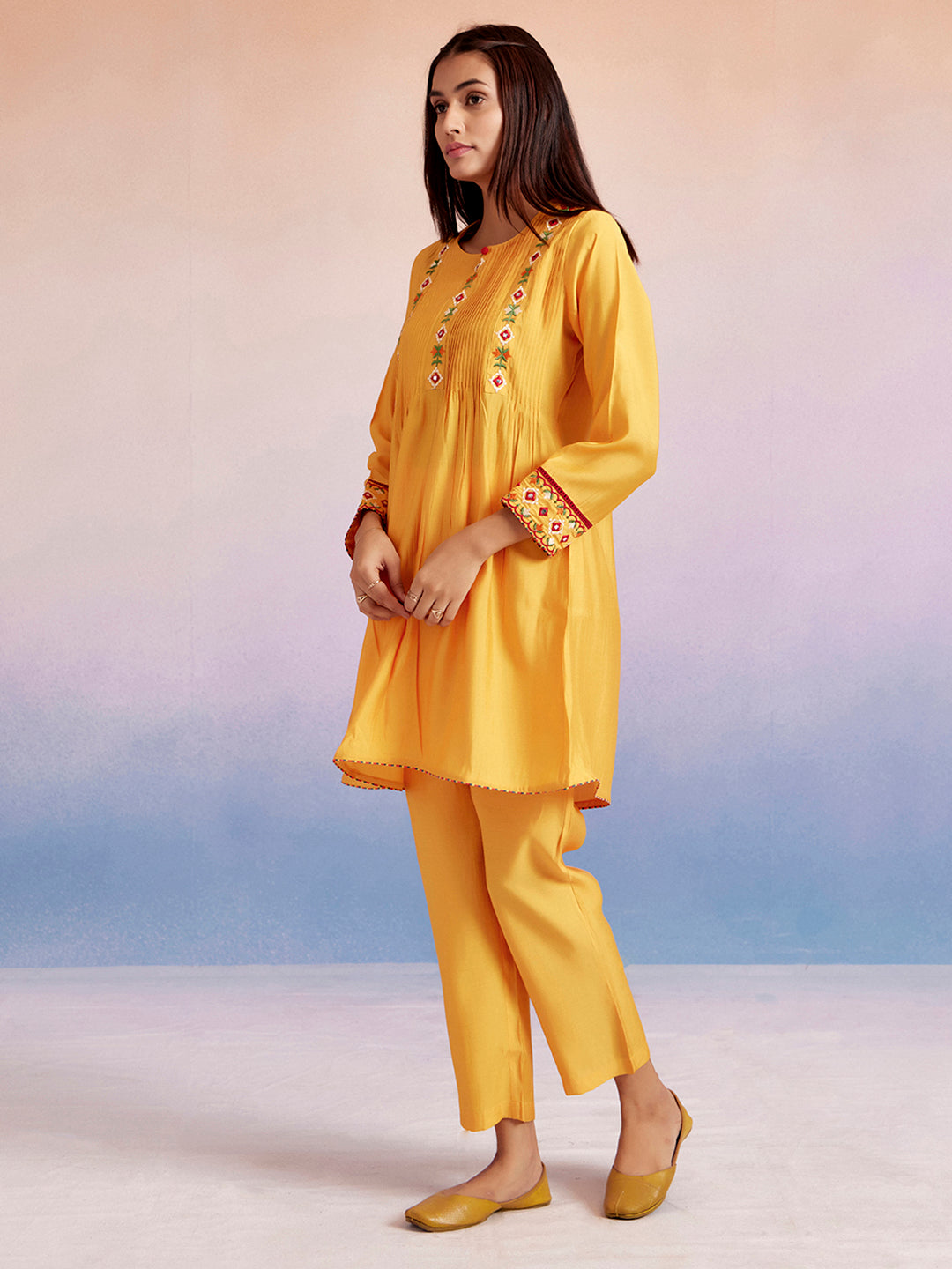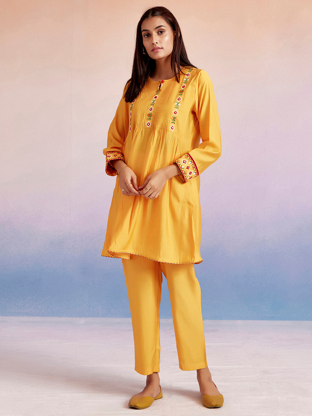 Embrace a subtle and stylish look in this Yellow Mirror Work Embroidered Festive Co-ord Set. It comes with a round-neck kurta with an embroidered yoke with pleated details and three-quarter embroidered sleeves. It is paired with solid pants.