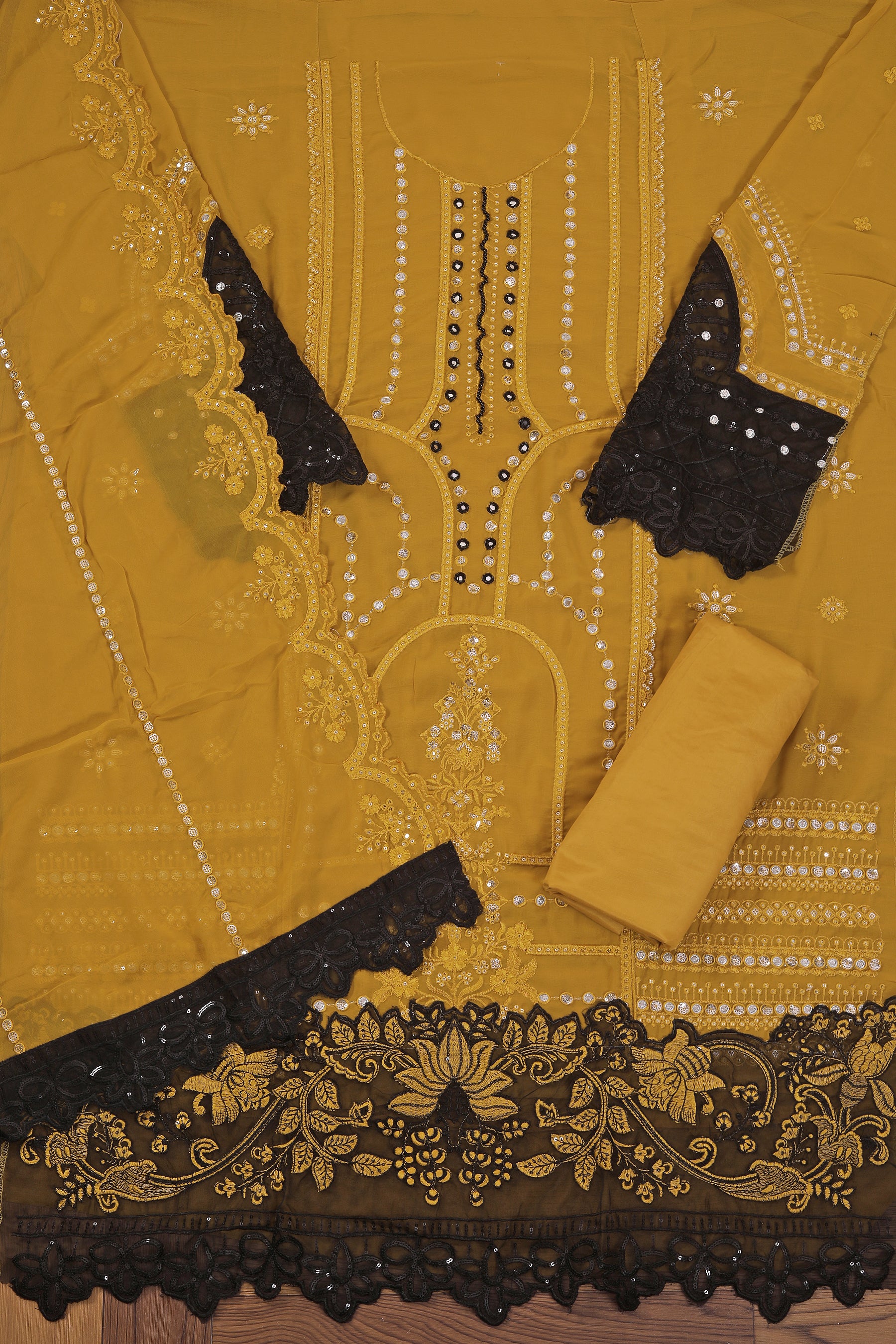 Mustard Embroidered Poly Georgette Dress Material with Dupatta