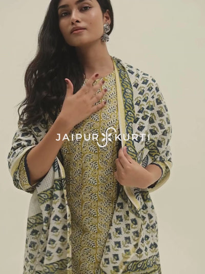 Embrace the comfort of cotton with this soothing Mustard Handblock Printed Cotton Suit Set. The kurta has a round neck with keyhole, three-quarter pleated sleeves and kantha work details. Paired with a partially elasticated waistband and printed dupatta.