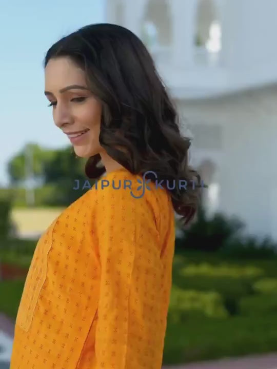 Mustard Yarn Dyed Self Weave Chanderi Kurta, Has Embroidered Yoke With Mirror Embroidery, Has Three-Fourth Regular Sleeves, Has A Straight Hem