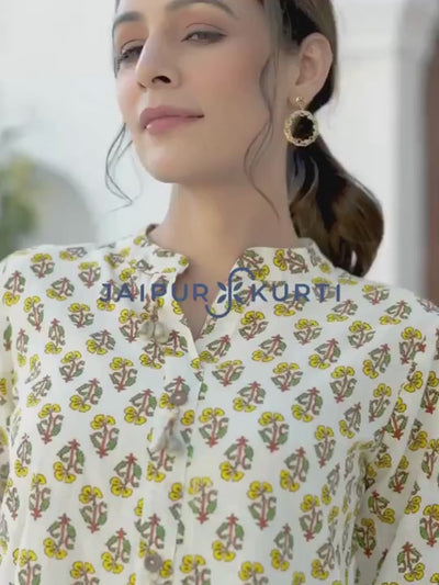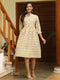 Embrace the fit and flare drama with Off White Ethnic Printed Flared Cotton Dress. The stunning dress features a shirt collar, buttons on the front placket, three-quarter puffed sleeves, a front opening, and a matching belt with a wooden buckle.