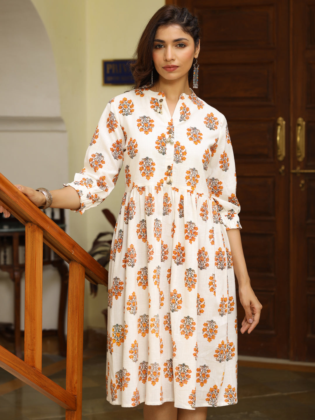 Make a statement this season in this Off White Ethnic Floral Printed Cotton Flared Dress. It is made of a premium cotton cambric fabric and is ideal for wearing to work or for lunch. It is calf-length, features three-quarter sleeves with gathered cuffs, a mandarin collar, gorgeous prints, buttons on the front placket with shells, gathers below the waist, and a flared hemline.