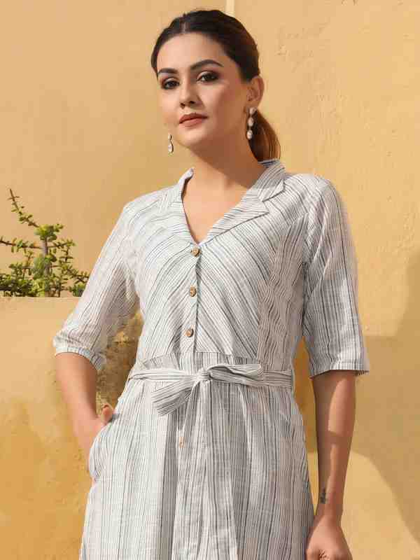 Off White Cotton Yarn Dyed A Line Shirt Dress With Wodden Button Closure On Front Placket Along With Fabric Belt Detailing, Side Pockets.