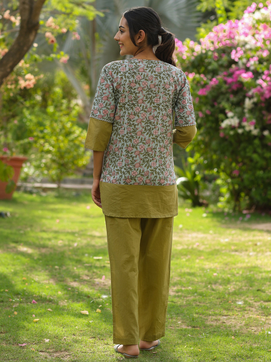 Olive Green Floral Printed Cotton Top With Solid Pants Loungewear Set