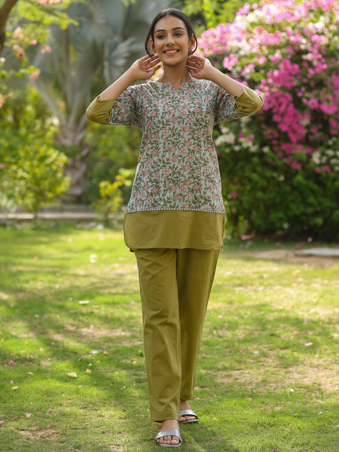 Make a statement in an Olive Green Floral Printed Cotton Top With Solid Pants Loungewear Set. Crafted from the plushest cotton cambric fabrics, this set features a top with a round neck with a notch, three-quarter sleeves with a pom-pom lace solid border, side slits, and a curved hemline. Paired with solid pants with a partially elasticated waistband and 2 side pockets.