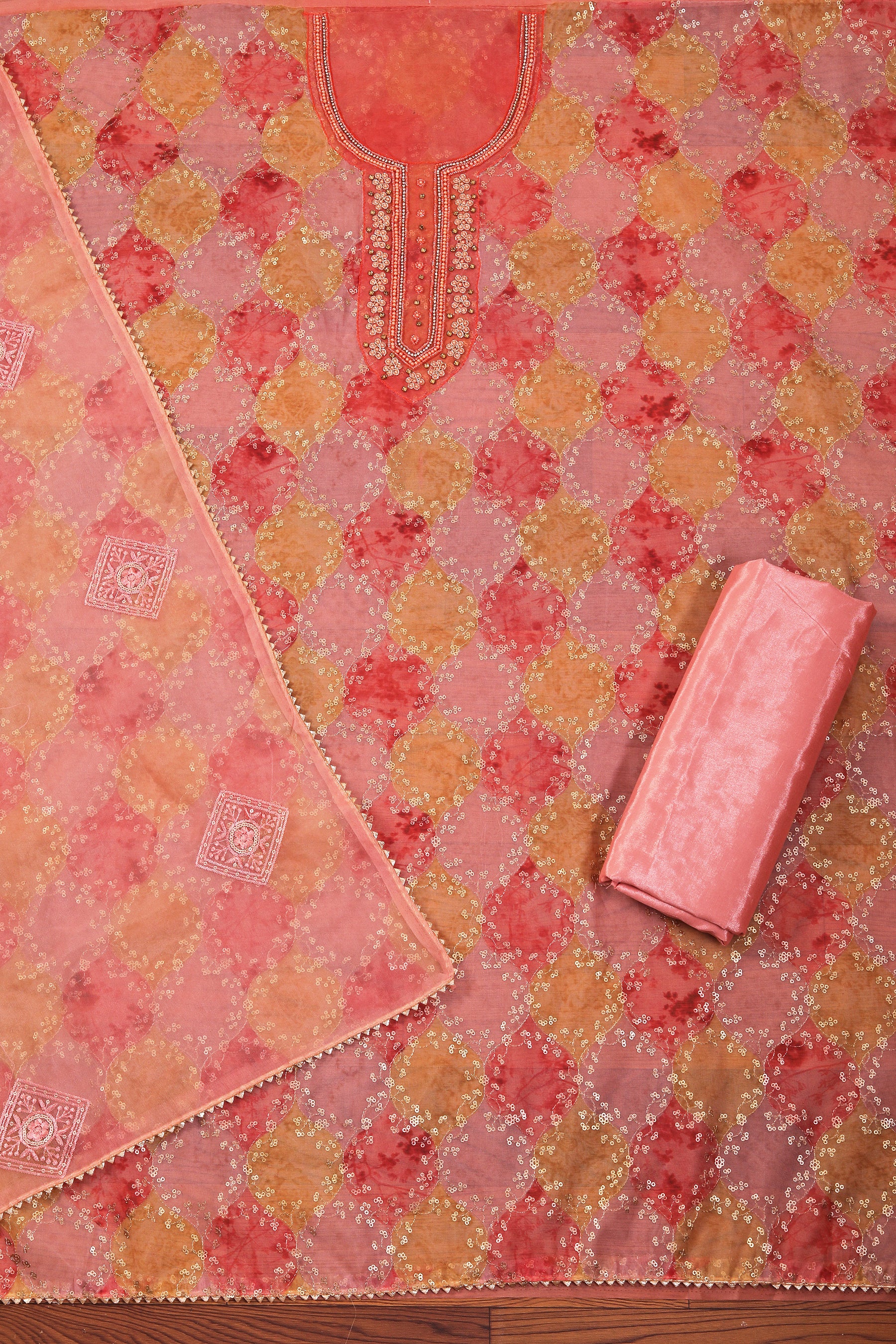 Orange Sequinned Organza Dress Material With Embellished Dupatta