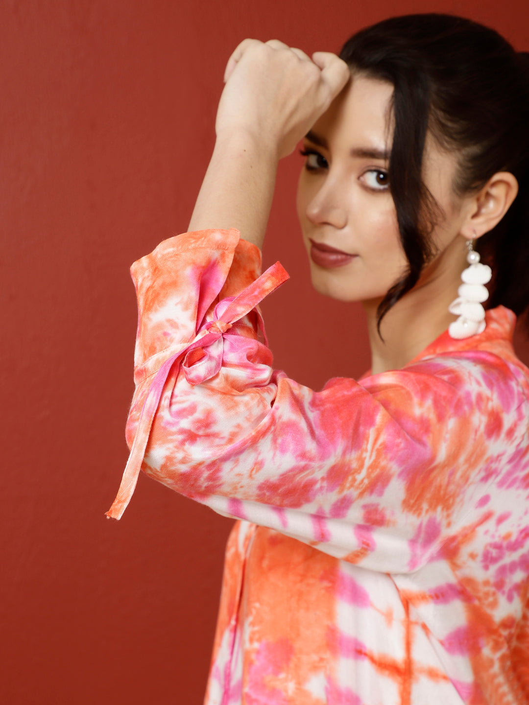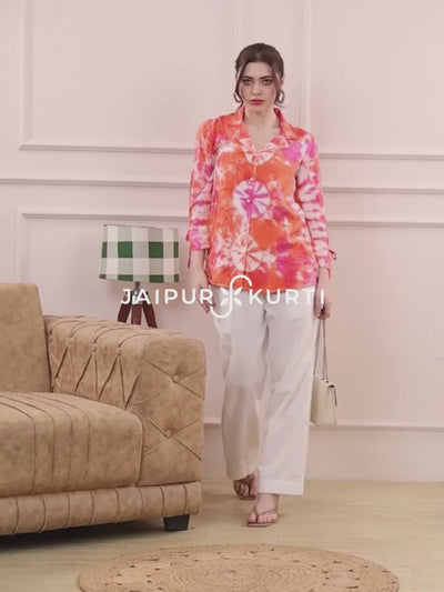 Be summer-ready in this Orange Tie Dye Shirt. It has a collar shirt, three-quarter tie-up sleeves and a relaxed fit.
