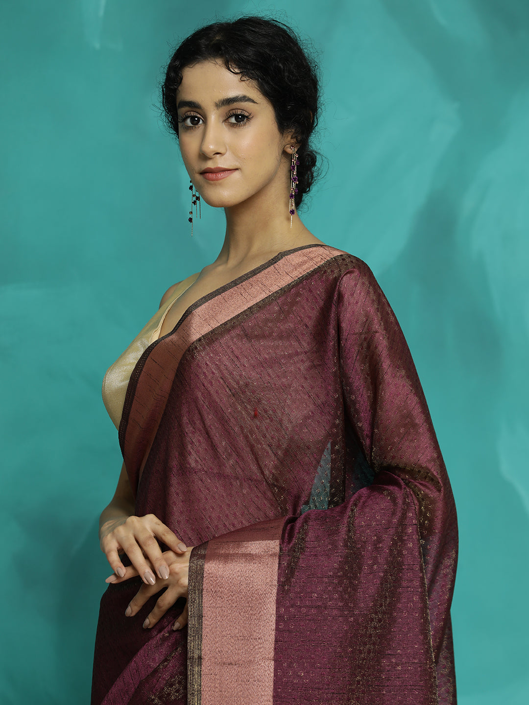 A festive must-have, this Wine color Party Wear Banarasi Organza Saree has zari woven designs all over.
