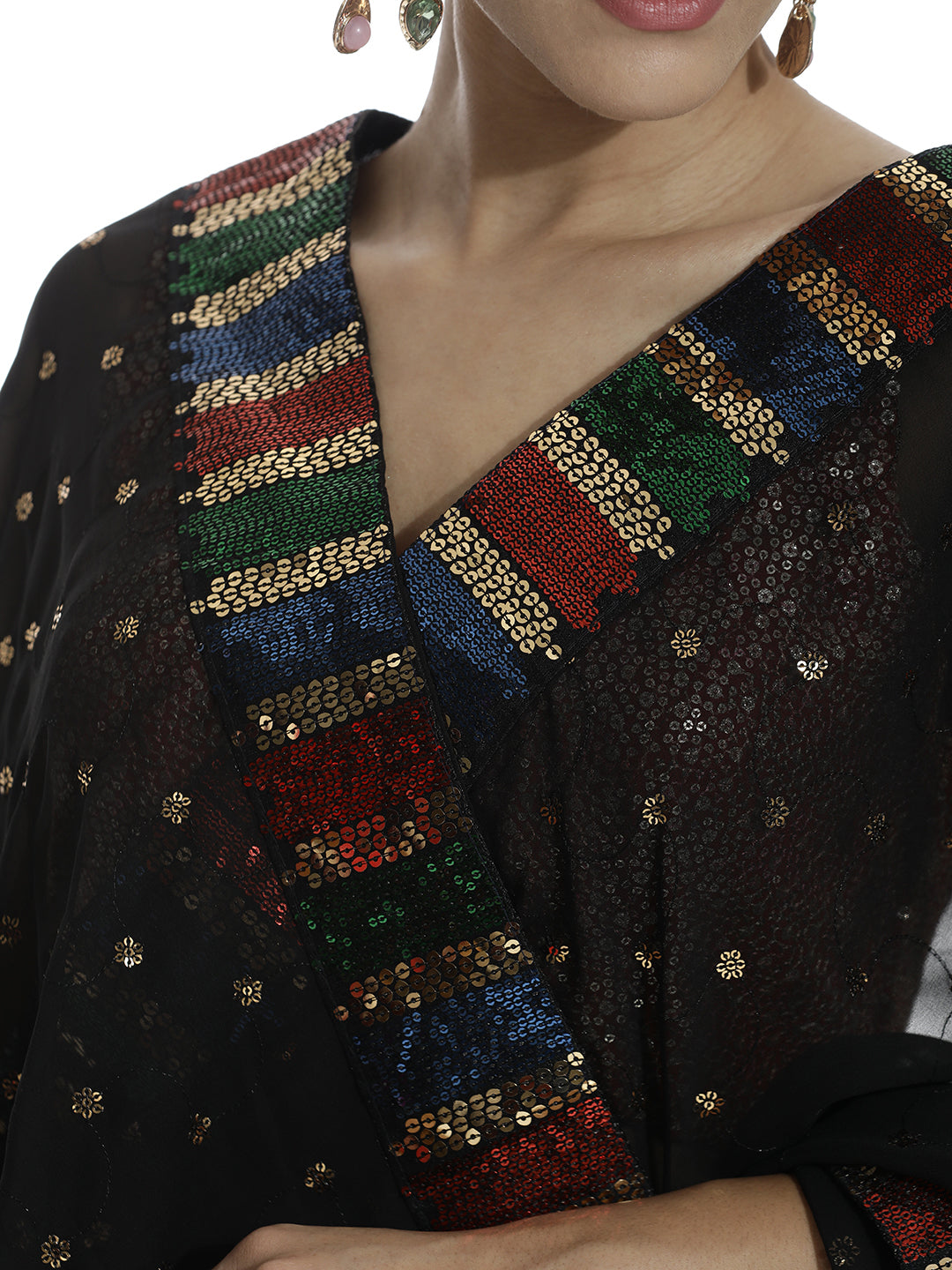 This Party Wear Sequin Work Black Georgette Saree is a party essential. It has sequins embroidered details and a colorful sequin border.