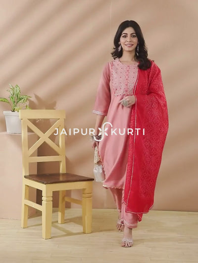 Peach Embroidered Straight Kurta With Pants And Dupatta