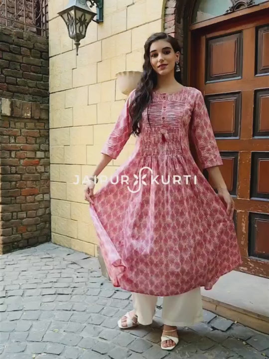 Peach Ethnic Floral Printed Pin Tuck A-Line Kurta