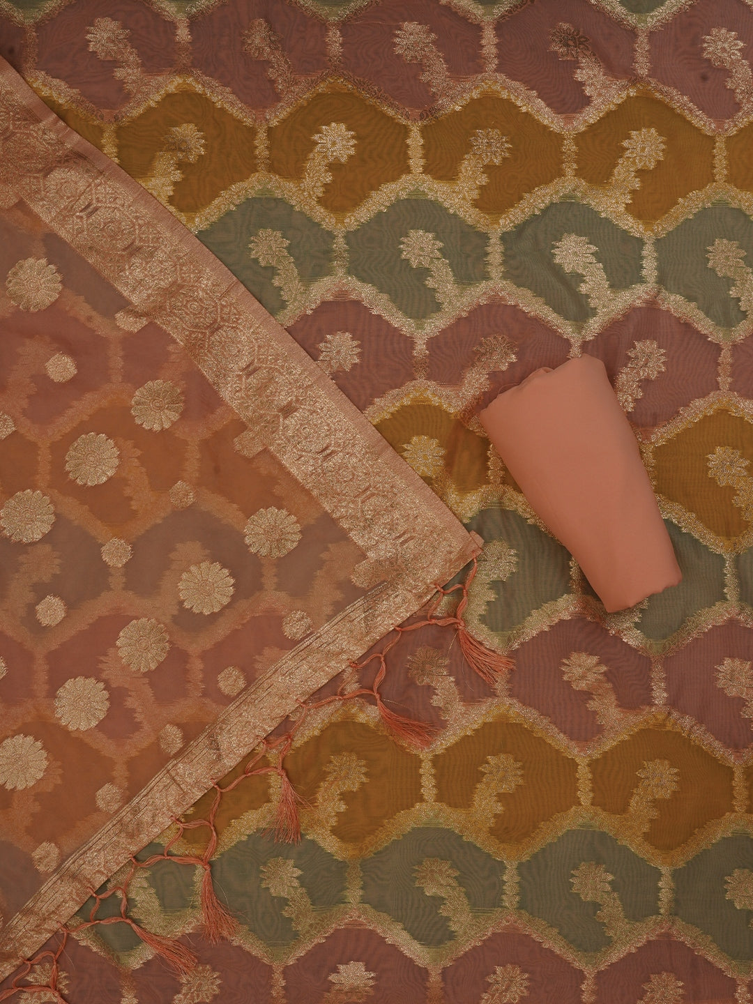Peach Unstitched Zari Woven Organza Dress Material With Dupatta