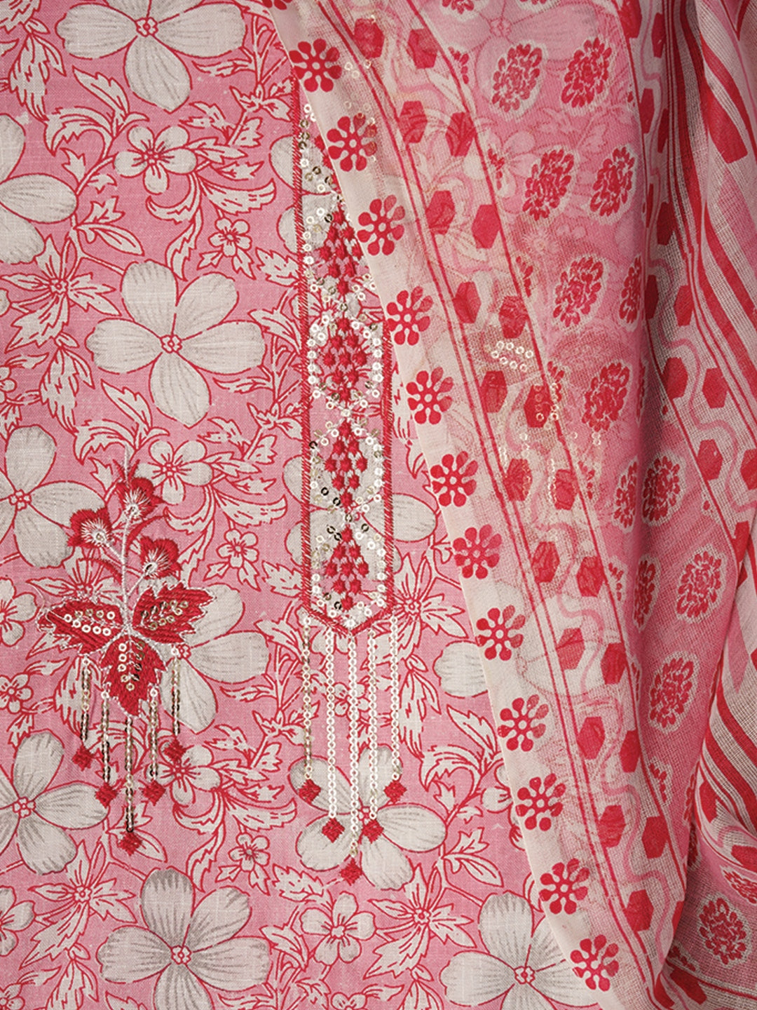 Pink Embellished Floral Printed Pure Cotton Dress Material with Dupatta