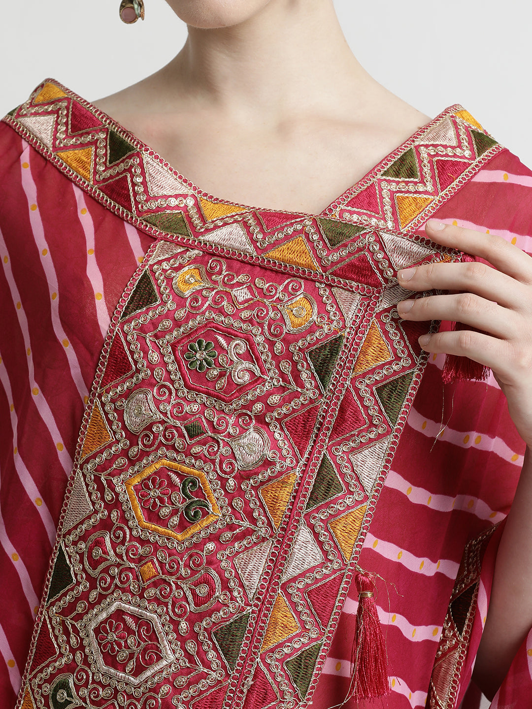 Give a traditional touch to your wardrobe with this Leheriya Embroidered Pure Georgette Saree. It has embroidered lace on borders and tassels at the hems.