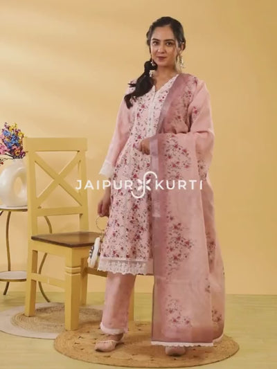 A floral-flowy piece to brighten your wardrobe! This Pink Rose Printed Pakistani Kurta With Palazzo And Dupatta is a must-have. The kurta has a V-neckline, three-quarter sleeves, white lace details and a side pocket. The palazzo has a partially elasticated waistband and lace details. The dupatta has a beautiful combination of prints and lace details.