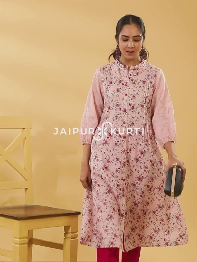 Flaunt this beautiful Pink Rose Printed A-line Kurta made in linen blend fabric. It has a round neck, embroidered three-quarter sleeves and a pleated neckline.