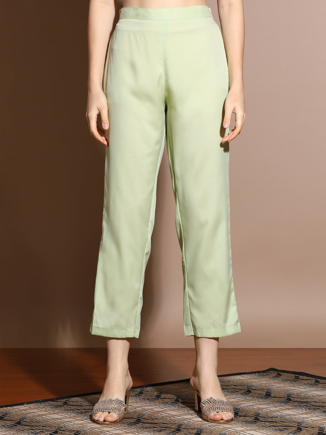 Add this glamorous Pista Green Chanderi Woven Festive Design Kurta Set With Dupatta to your wardrobe. The kurta has a v-neck with an embroidered yoke, three-quarter sleeves and a straight hemline. It is paired with solid pants and a net dupatta with lace.