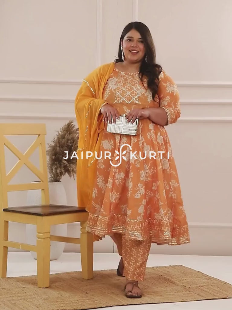 Swirl in style, as you step out in our Plus Size Floral Printed & Gotta Work Suit Set. This suit set is made in Viscose Rayon Blend Slub fabric. The kurta features a round neckline, gota lace work on the yoke, three-quarter sleeves and printed hems with lace. Paired with regular pants with abstract prints and a solid dupatta.