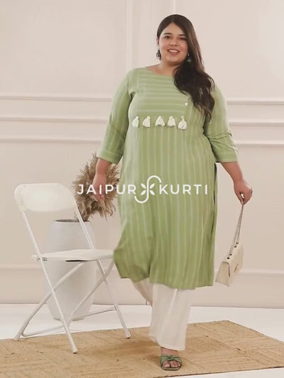 Revamp your spring/summer wardrobe with this Plus Size Green Floral Printed Straight Kurta made of viscose rayon. It features puffed sleeves, a mandarin collar, a front button placket, and a straight hemline.