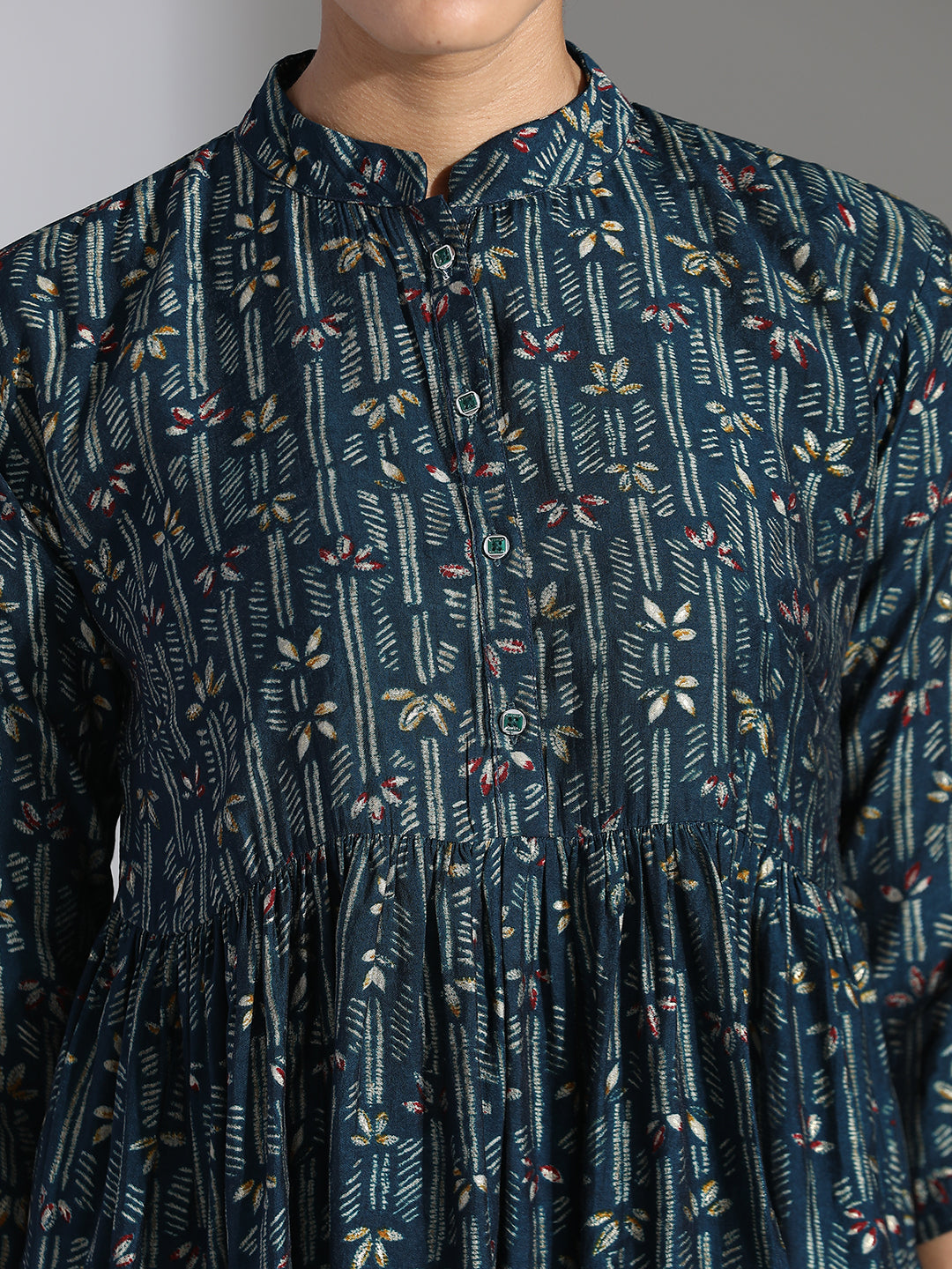 Make a statement in this Printed Cotton Peplum Top. It has a mandarin collar, regular three-quarter sleeves and pleated details.