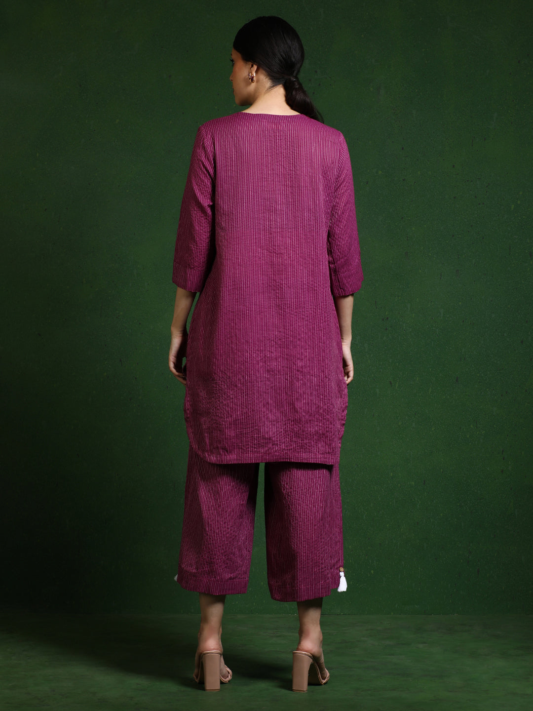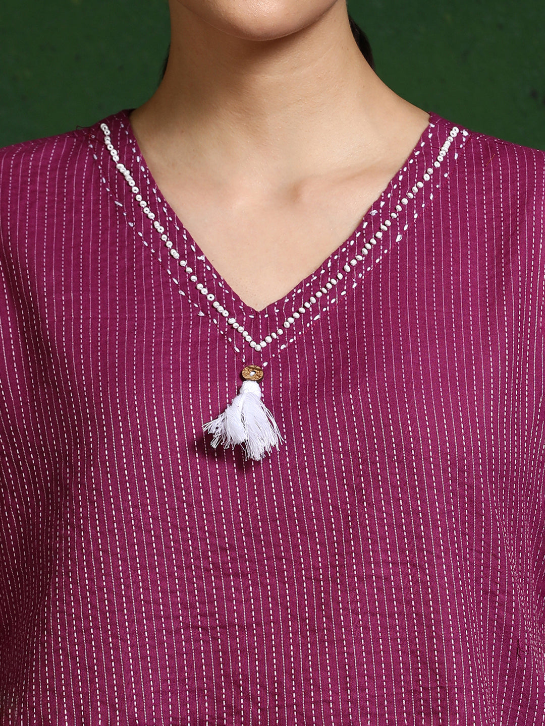 Embrace a comforting style with this Floral Solid Pure Cotton Purple Kurta Sets. This Straight Kurta For Women has a V-Neck, Three-Quarter Sleeves With Thread Work. Paired With a Palazzos.