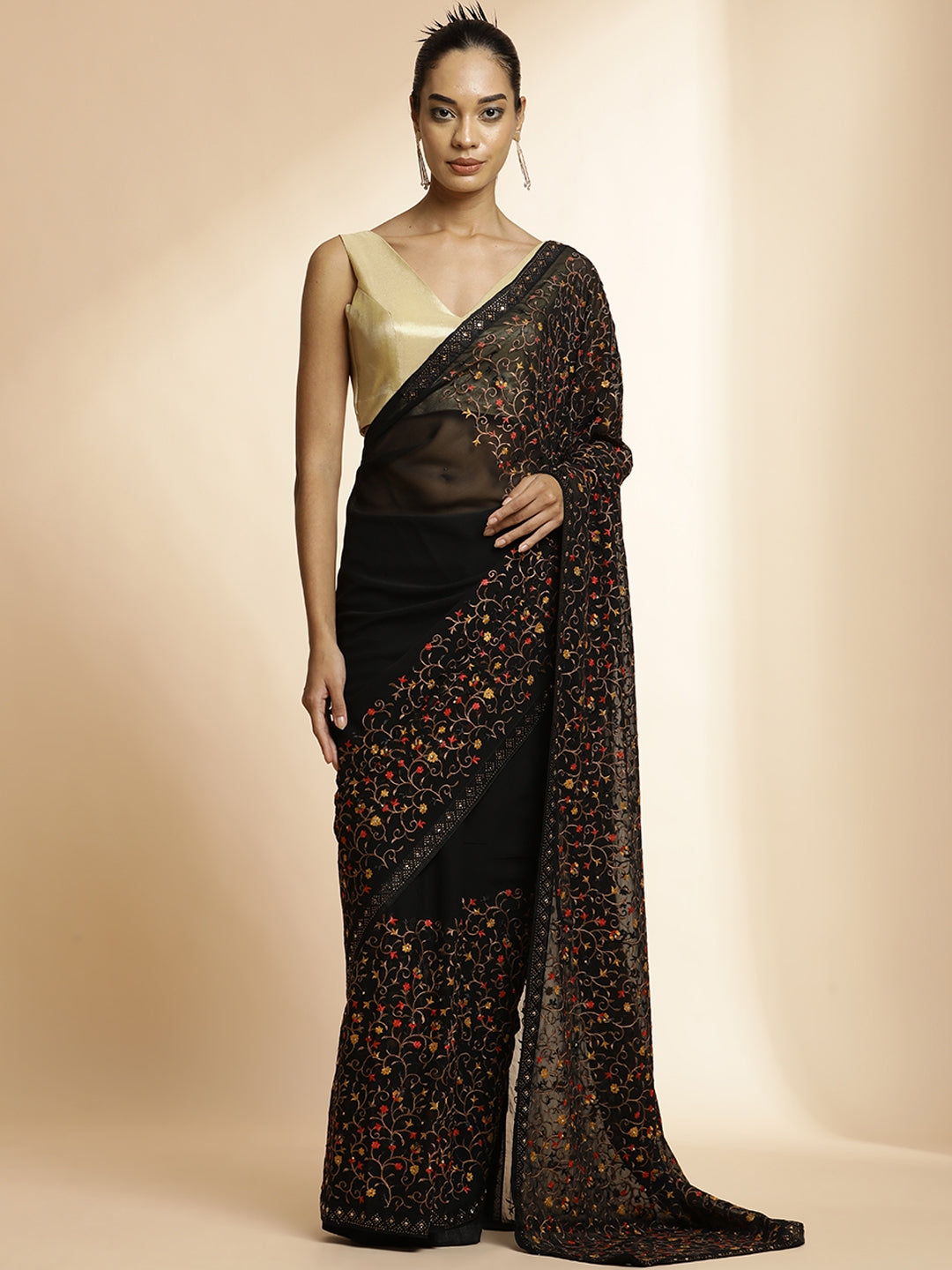 Embrace a glam look with this Pure Georgette Sequin Work Heavy Saree. It has fine sequin work in stripes and premium pure georgette.